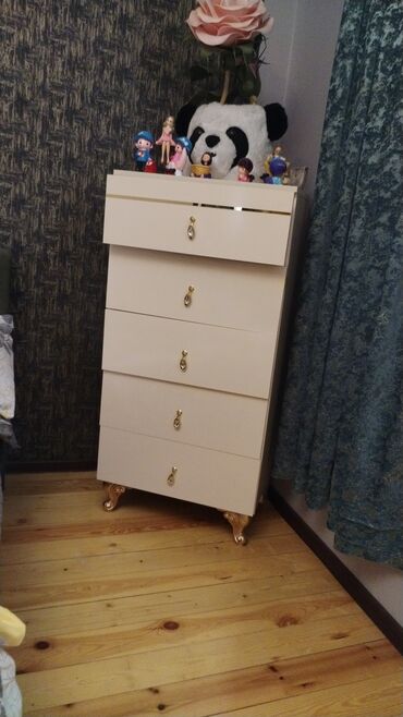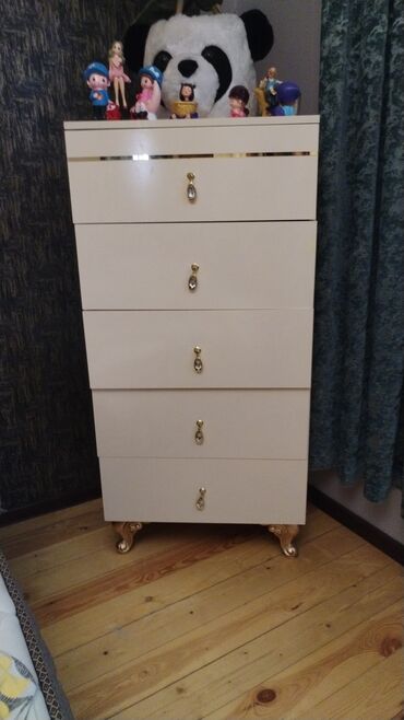 Klassik üslubda krem rəngli komod/şkaf. - Korpus: taxta əsaslı material, dekorativ panelli ön səthlər - Rəng: açıq krem, qızılı detallı tutacaqlar - Ölçü təxmini: orta hündürlük, 1 metrə yaxın en ...