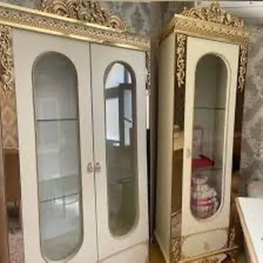 - Vitrin şkafları: iki hissədən ibarət. Ön qapılar oval şüşə panellidir, içəridə şüşə rəflər yerləşir – qab-qacaq, dekor əşyaları və kolleksiyalar üçün uyğundur. Üst hissədə qızılı ornamentli tac bəzək, kənarlarda dekorativ elementlər var. Krem-qızılı rəng palitrası dəstlə uyğunluq yaradır.