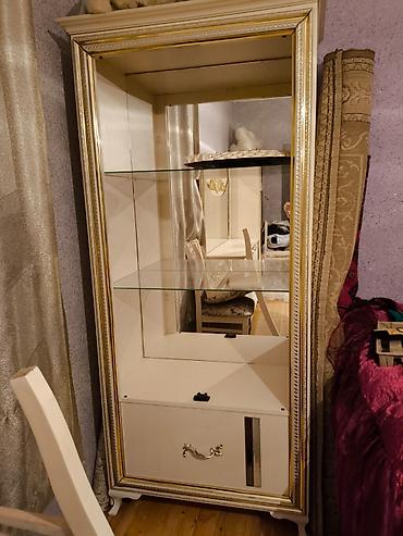 - Vitrin şkafı: krem rəngli korpus, qızılı bəzəklər, içəridə güzgü arxa panel, 2 ədəd şüşə rəf, aşağıda dekorativ tutacaqlı qapalı bölmə.