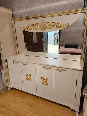 - Bufet-komod güzgülü: geniş üst səth, 4 qapılı saxlama bölməsi, ön hissədə relyef qızılı ornamentlər və dekorativ tutacaqlar, iri divar güzgüsü ilə tam komplekt.