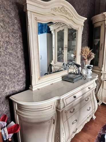 Klassik üslubda krem rəngli mebel dəsti - Şkaf: İkiqat şüşəli qapı, aşağıda iki geniş siyirmə. Qızılı dekorativ kənarlar, metal ornamentli tutacaqlar, təkərli ayaqlar. - Konsol-güzgü: Dalğalı form...