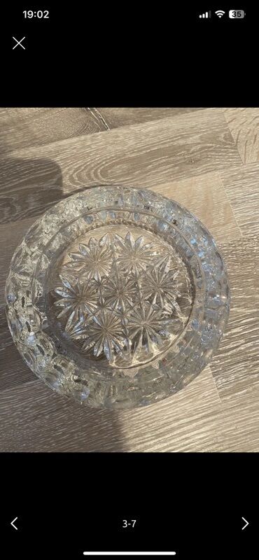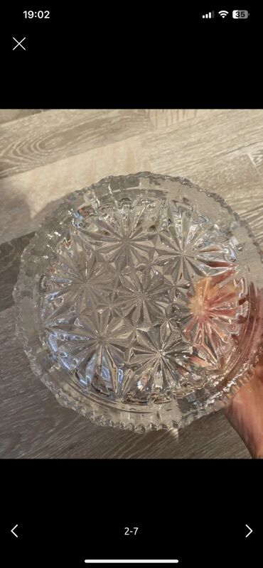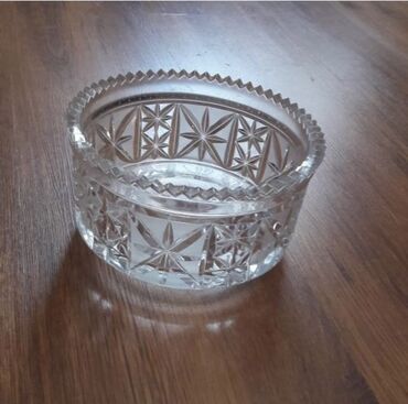- Dairəvi kristal qab: Yanları ulduzvari oyma naxışlı, kənarı dişli kəsimli çoxməqsədli qab (konfet, salat, zərgərlik və s. üçün uyğundur).