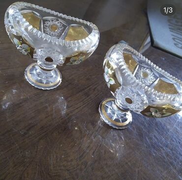 - 2 ədəd dekorativ şirniyyat/konfet qabı: Ayaqlı, kənarları dişli kəsimli, üzərində qızılı işləmə və çiçək rəsmləri olan kristal kompotnik tipli qablar.