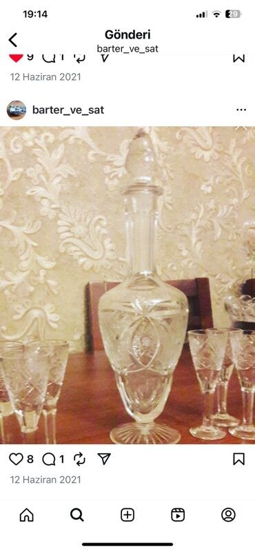- Karaf və qədəh dəsti: Ştamplı naxışlı, taplaqlı kristal karaf. Yanında eyni üslubda incə oyma ornamentli 6 ədəd likör/qabaq qədəhi.