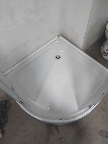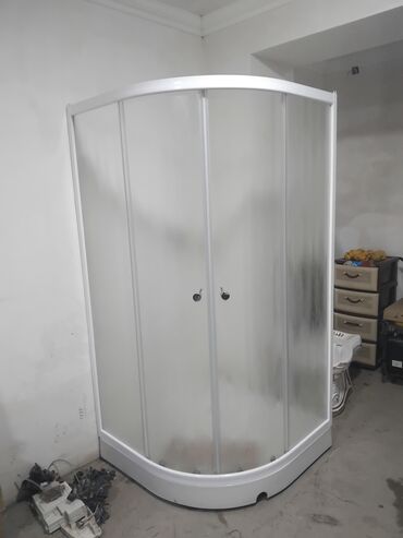 Ölçü təxmini: 100x100sm (şəkillərə əsasən; künc radiuslu). Mənzil və ya ofis sanitar qovşaqları üçün rahat və funksional duş kabini.