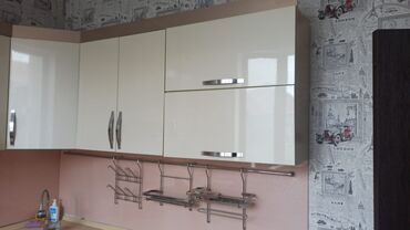 - Üst və alt şkaflar: parlaq krem fasadlar, metal tutacaqlar, künc modulu daxil