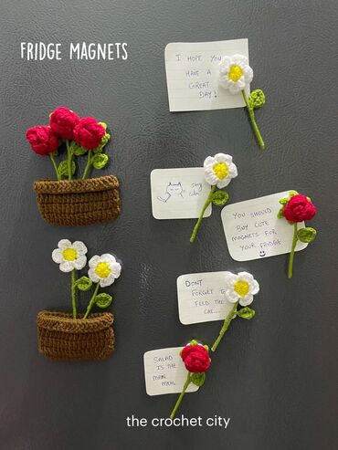 - Buzdolabı üçün maqnitlər: toxunma güllər və kiçik səbətlər formasında. Qeyd-vərəqləri saxlamaq və dekor üçün uyğundur; güclü maqnit arxası sayəsində lövhə və soyuducu səthində möhkəm tutur.
