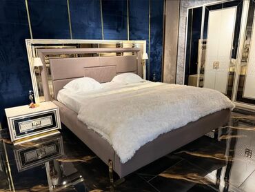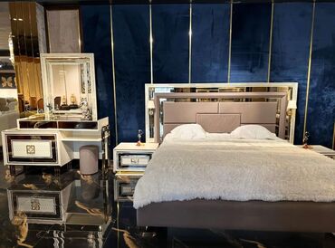 - King-size çarpayı: yumşaq başlıq, parça üzlük; başlıqda güzgü və metal dekor panelləri.