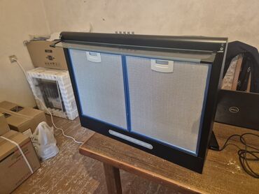 Qutu məzmunu şəkillərdə: cihaz, filtr panelləri, arxa hissədə texniki etiket və iki turbinli daxili quruluş görünür. Mətbəx dolabının altına quraşdırmaya uyğundur.
