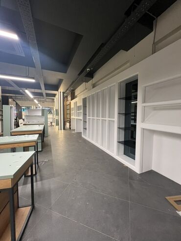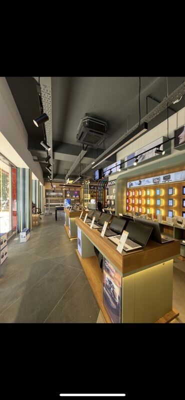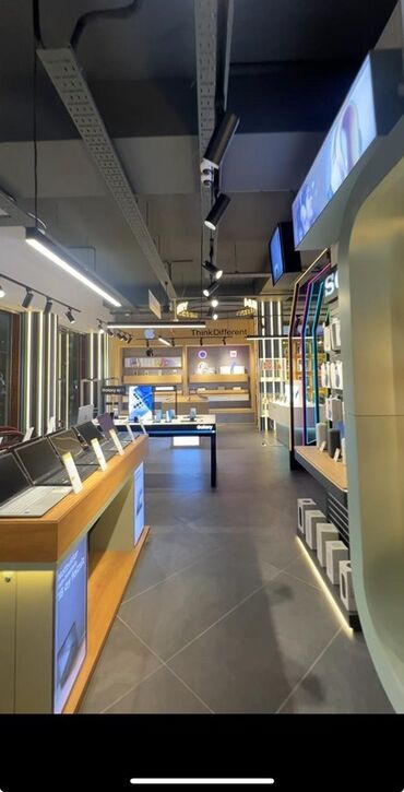 - Mağaza tavan işıqlandırma xətti: rels üzərində spotlar və asma işıq panelləri (şəkillərdə görünən)