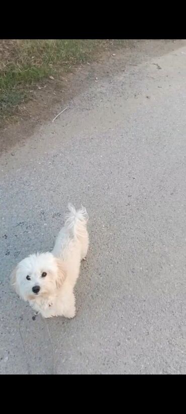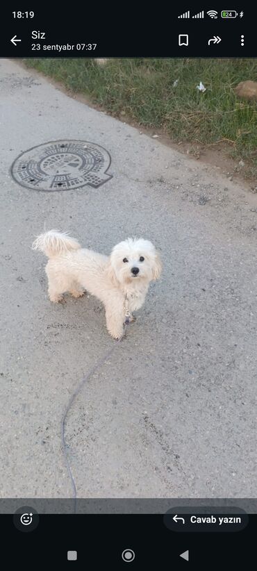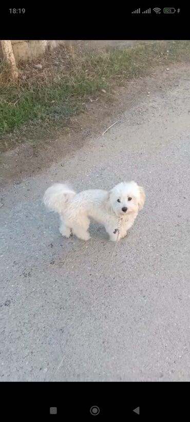 Ağıllı və mehriban xırda ölçülü it – ağ, qıvrım tüklü toy tipli cins (Maltipoo/Bişon tipajı).