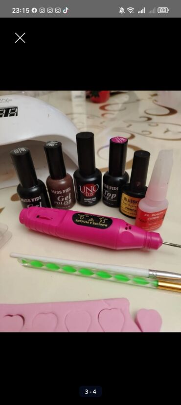 - Gel laklar: Miss Fidi (bir neçə rəng), UNO LUX Rubber Base, Miss Fidi Top Coat