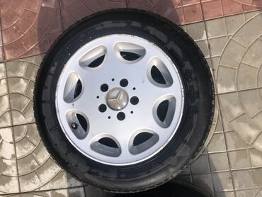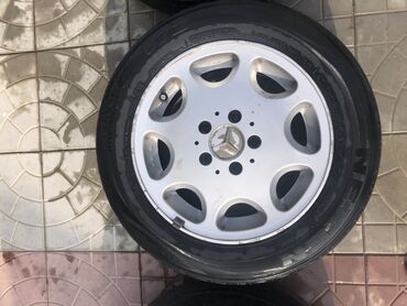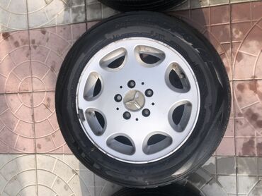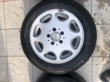 - 4 ədəd yüngül lehimli Mercedes diski, 5 boltlu, zavod ornamentli (gümüş rəng). Disk üzərində Mercedes loqolu mərkəz qapaqları görünür.