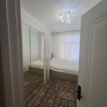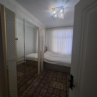 Mənzil fotolarda görünən mebel və aksesuarlarla təqdim olunur: yataq, qarderob, masa-stul dəsti, dəhliz konsolu və oturacaq. İşıqlandırma bəzəkli lüstür və spotlarla həll edilib.