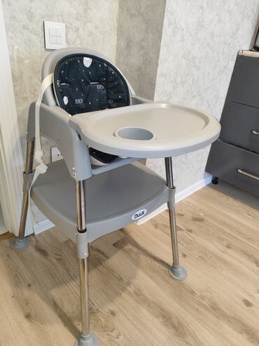 Uşaq yemək stulu - Rəng: tünd boz/qaranlıq tonlarda - Yumşaq, yastıqlı oturacaq və arxalıq - Önündə geniş çıxarıla bilən yemək masası və stəkanlıq - Hündürlüyü tənzimlənən konstruksiya (yan hissəd...