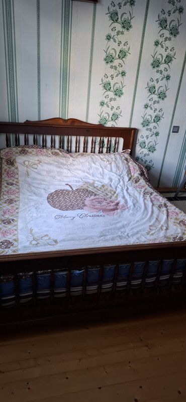 Qeyd: Şəkildəki döşək və yataq dəsti vizual məqsədlidir; çarpayı karkası taxtadandır. Ölçüləri dəqiqləşdirmək üçün mövcud olan geniş ikinəfərlik formatına uyğundur.