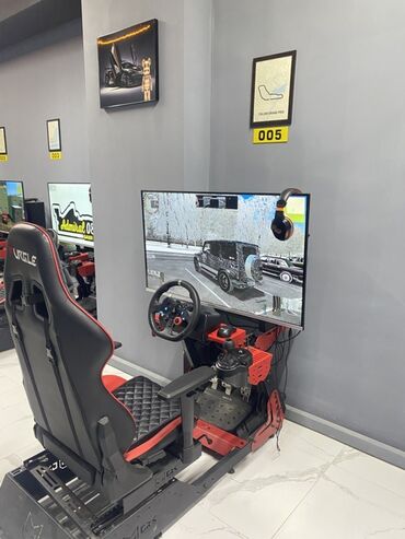 - Peşəkar sükan-setli yarış/kartinq simulyatoru: tənzimlənən oturacaq, pedal bloku, sürət qutusu, qulaqlıq asqısı və geniş ekran
