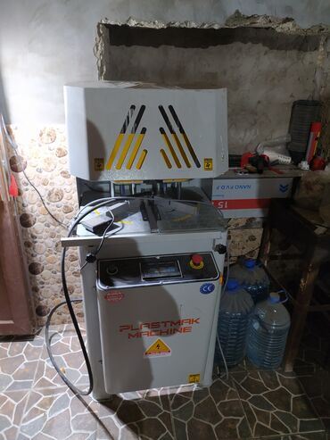 - Plastmak Machine markalı köşə birləşdirmə/möhürləmə presi (CE nişanlı). Üst qoruyucu qapaqlı, idarəetmə paneli, fövqəladə dayandırma düyməsi və tənzimlənən parametrlərlə.