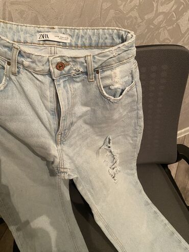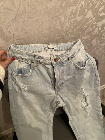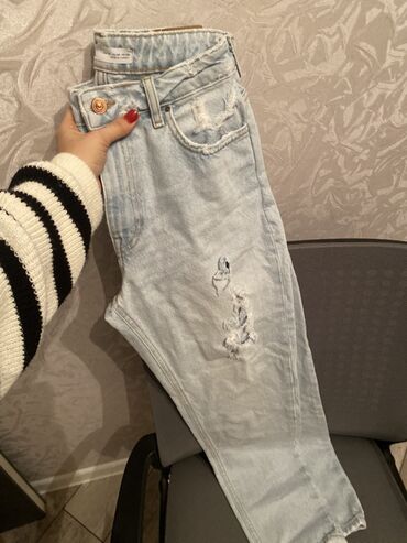 Ölçü etiketində “EUR MEX USA” qeyd olunub (etiket görünür), orta ölçülərə uyğundur. Açıq mavi rəng və yırtıq detallar sayəsində yaz‑yay kombinlərinə ideal seçimdir.