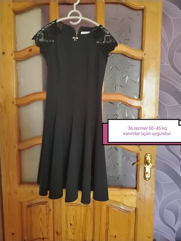- Qara midi paltar: qısa krujeva qollar, yüngül ətək açılımı, sinədə kiçik bər-bəzək detalı; klassik və eleqant görünüş. Qiymeti iyirmi bes manat