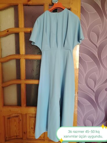 - Açıq mavi midi paltar: arxadan gizli fermuar, qısa geniş qol, bel hissədə yığma tikişlər; zərif siluetli. Qiymeti qirx manat
