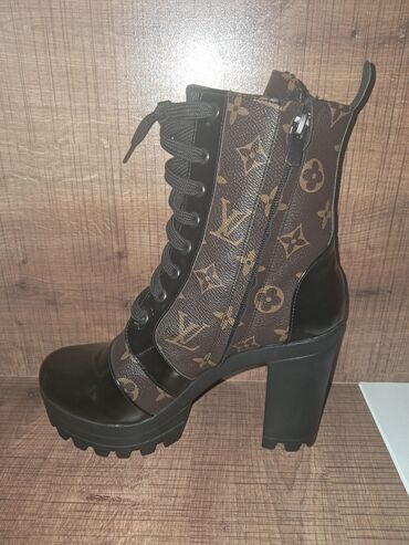 - Material: parlaq lak effektli burun və arxa hissə, teksturalı monoqramlı sintetik/deri üst, rezin platforma və protektorlu altlıq