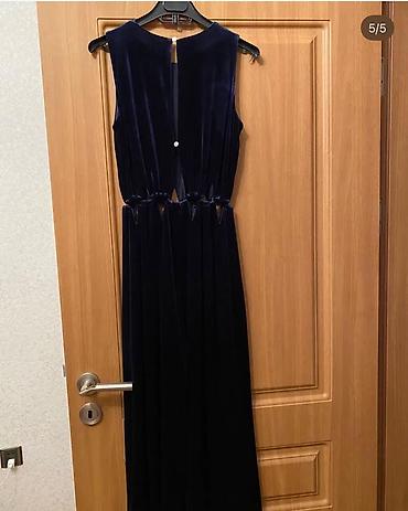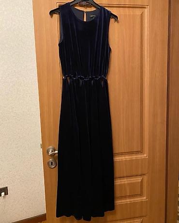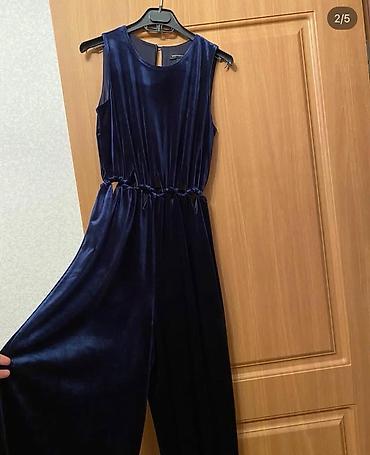 Zərif siluet yaradan, bədəni sıxmadan oturan, parçası işıqda gözəl parlayan şık bir tünd göy məxmər kombinezon.