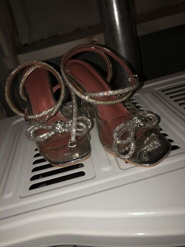 Gümüşü rəngdə qadın sandaleti 40-41 razmere uygundu - Açıq burunlu, tək zolaqlı model - Zolağın üzərində iri, parlaq daşlarla bəzək (çiçək/qönçə motivi) - İncə topuqdan bağlanma: tənzimlənən qayış ...