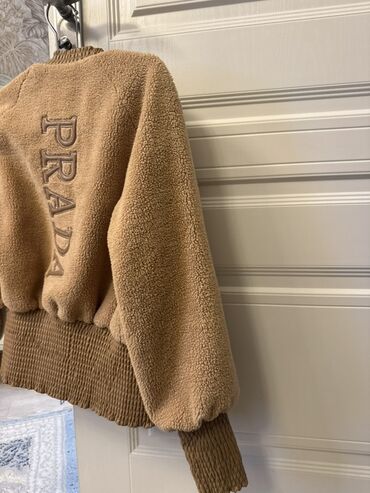 Prada qadın jaketi – teddy/şerpa teksturalı, bej rəngdə. - Model: bomber tipli, yaxası, bel hissəsi və manjetləri elastik trikotaj. - Material: yumşaq xəz effekti olan parça; iç hissə dəri görünüşl...