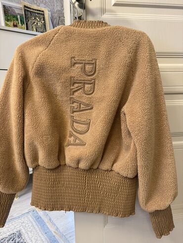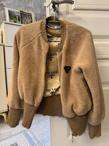 Prada qadın bomber gödəkçə - Rəng: karamellik/bej - Material: yumşaq teddy/şerpa toxuması (xarici), içlikdə saten toxumalı astar üzərində Prada Milano loqotipləri - Dizayn: klassik bomber kəsim, g...