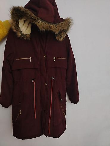 Qadın qış parkası – tünd bordo rəng - Qalın, isti model; iç tərəfi yumşaq süni xəz/plyuş astarlı - Kapüşonlu, kənarı tünd rəngli süni xəzlə bəzədilmiş - Ön hissədə ikili bağlanma: gizli fermuar və ...
