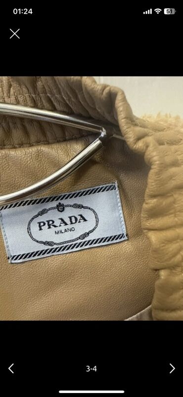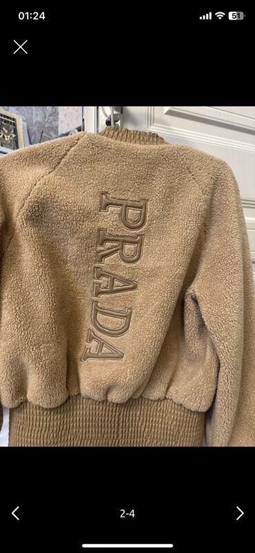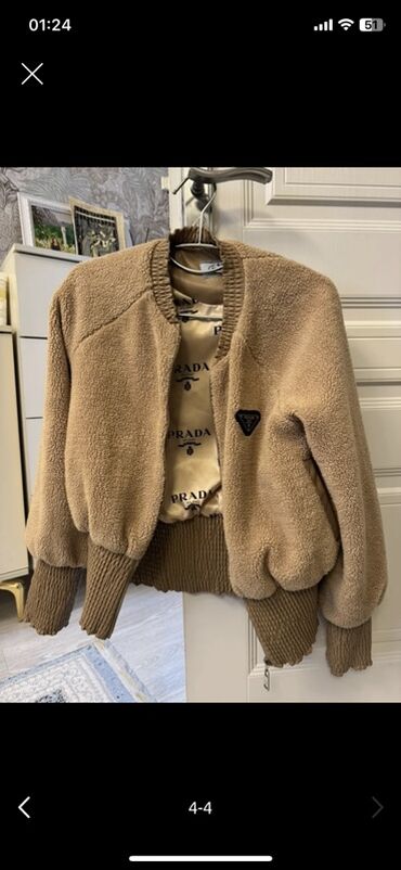 Prada qadın jaketi - Model: arxa hissədə iri “PRADA” loqosu ilə - Material: yumşaq teddiyə bənzər şerpa/kürk teksturalı parça; iç hissədə dəri effekti olan örtük - Rəng: karamel/qəhvəyi bej - Kəsi...