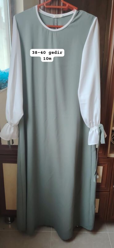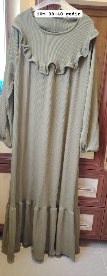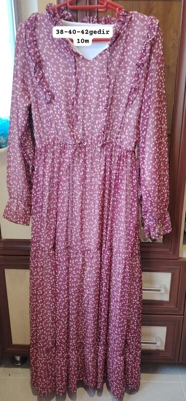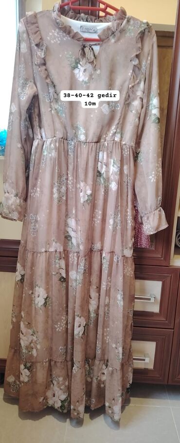 - Detallar: frill bəzəklər, boğazda bağlama, yüngül şifon üst qat, uzun qol, qat-qat ətək