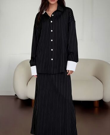 - Dizayn xüsusiyyətləri: arxadan səliqəli düşüm, ön tərəfdə tam düymə sırası, geniş manjetlər, zərif tikili, koordinasiya olunmuş iki parçalı görünüş (köynək + uzun ətək).