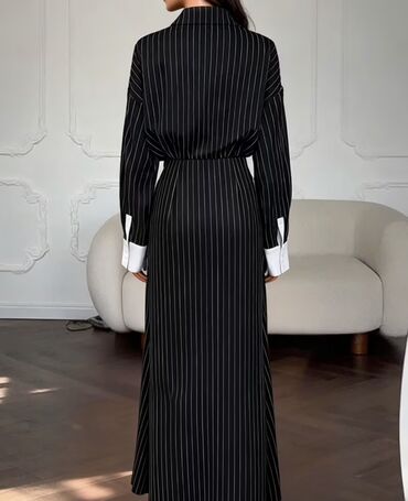 - Naxış: qara fonda incə vertikal ağ zolaqlar – bədəni vizual olaraq uzadır, ofis və tədbirlər üçün uyğun klassik görünüş yaradır.