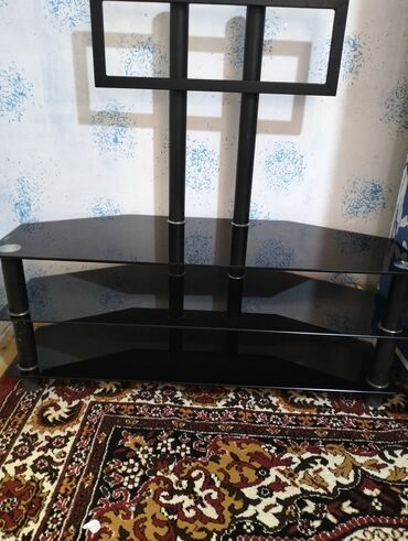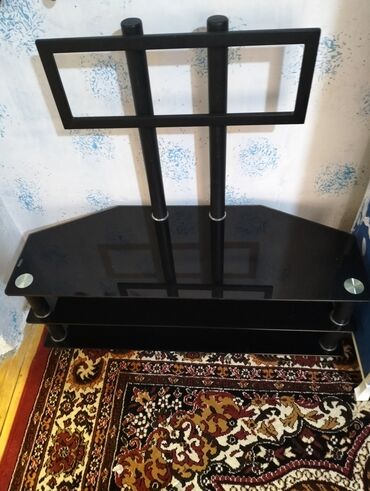 Qara şüşə TV stendi - Material: parlaq temperli qara şüşə rəflər, metal dayaqlar - Konstruksiya: 3 mərtəbəli; üst platforma TV üçün, orta kiçik rəf media pleyer/pritv üçün, alt geniş rəf konsol və...