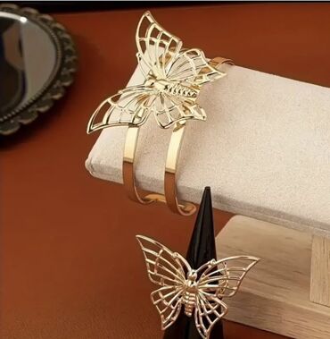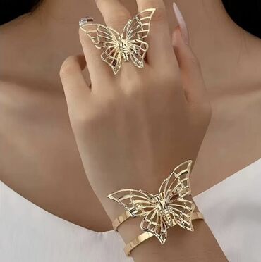 Gümüş rəngli zinət dəsti – bilərzik və üzük - Dizayn: Parlaq daşlarla bəzədilmiş iri kəpənək motivi. Bilərzik açıq formadadır, uclarından biri damla formalı daşla tamamlanıb, kəpənək elementi bilə...