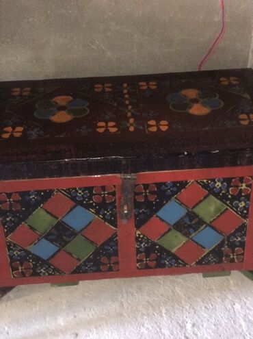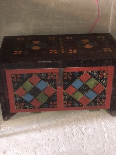 Əl işi boyalı taxta sandıq - Material: qalın massiv taxta, metal möhkəmləndirmələr və metal halqalı yan tutacaq - Ön hissə: iki qapılı, əl işi dekorativ naxışlar – qırmızı, sarı, ağ və qara rənglə...