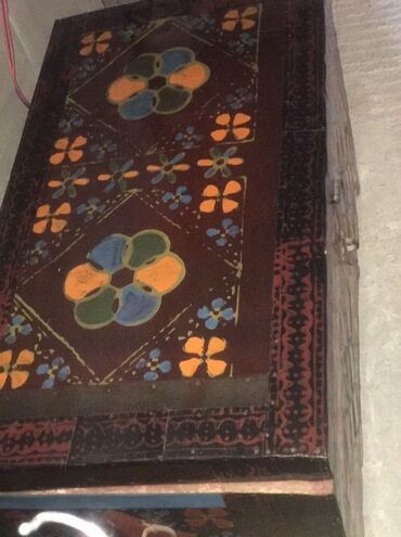 Rəngarəng naxışlarla bəzədilmiş taxta sandıq - Material: masiv taxta - Üstü və ön hissəsi əl işi dekorativ rəsmlərlə örtülüb: bitki motivləri, ulduz və ornamental naxışlar - Qapaqlı konstruksiya, ...