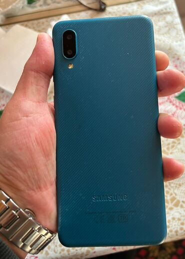 Samsung Galaxy A02s, mavi rəng. Xüsusiyyətlər: - 6.5" Infinity‑V ekran - Arxa kamera bloku: ikili modul və LED fləş - Ön kamera damcı çıxıntıda - 32 GB daxili yaddaş (şəkildə: 10.38 GB istifadə ol...