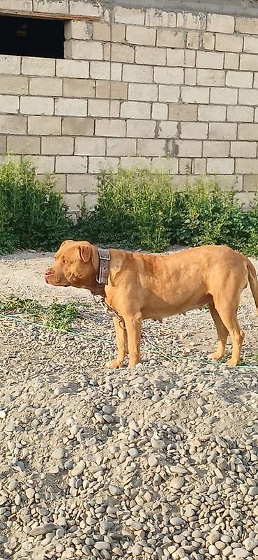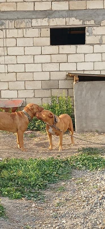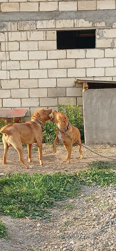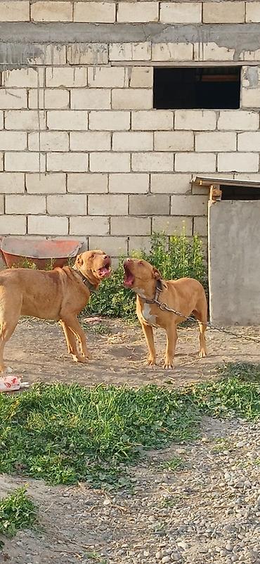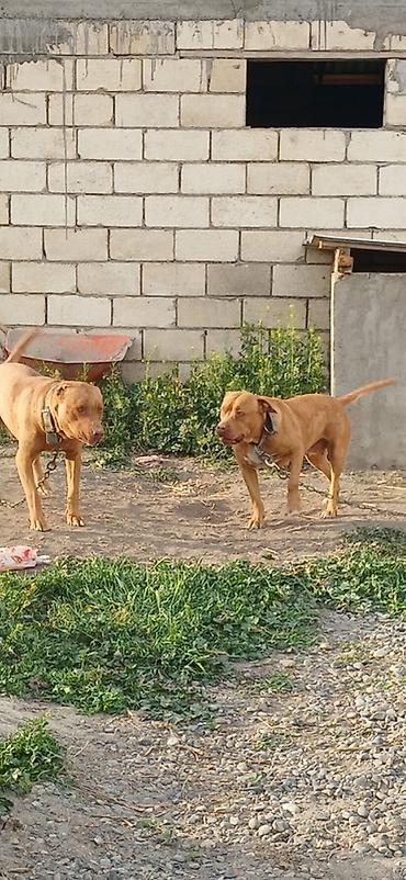 İki ədəd qırmızı rəngli, əzələli, qısa tüklü it (pitbull tipli) satışa çıxarılır. Hər ikisi güclü bədən quruluşuna, enli döş qəfəsinə və qalın boyunluğa malikdir. Qulaqlar təbii, quyruqlar bütöv, rəngləri tünd-sarı/qırmızı tonlarda, sinə və boğaz hissədə ağ ləkələr var. Çox enerjili, ayıq-sayıq və sahəyə bağlıdırlar. Zəncir və möhkəm yaxalıqla öyrəşdirilib, həyətyanı sahənin qorunması üçün uyğundur. Yaxşı fiziki aktivlik və düzgün bəslənmə tələb edirlər. Şəkillərdə hər iki it müxtəlif bucaqlardan görünür.