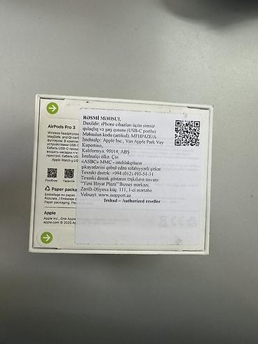 Yenidir, heç qutusundan açılmayıb. Məhsul: Apple AirPods Pro (2-ci nəsil) – MagSafe Şarj Qutusu ilə Xüsusiyyətlər: - Model: A3047, A3048, A2968 (qutu üzərində göstərilib), MTJV3LL/A - MagSafe Şar...