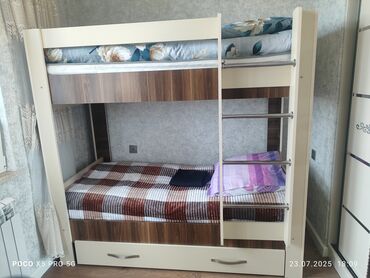 İkimərtəbəli dəmir çarpayı - Material: möhkəm metal karkas, toz boya ilə rənglənmiş - Dizayn: yuxarı qat üçün qoruyucu məhəccər, inteqrə olunmuş şaquli nərdivan; dekorativ tağ və bəzək elementləri...