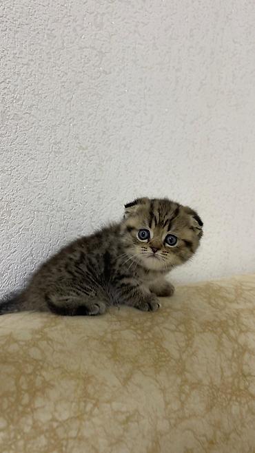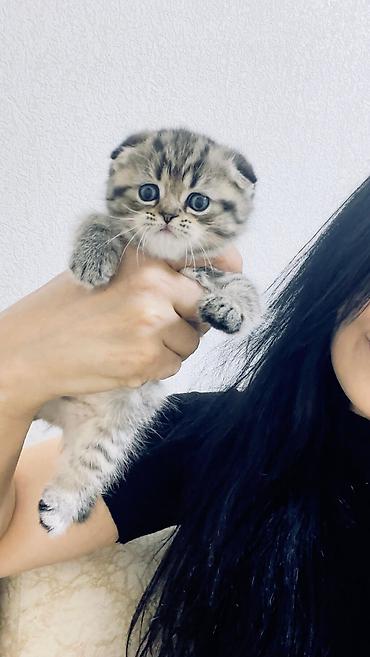 Şotland qıvrım qulaqlı pişik (Scottish Fold) – gözəl boz-ağ rəngli - Cins: Scottish Fold (qıvrım qulaqlı) - Rəng: boz-ağ bicolor, burnunda və sinəsində ağ naxış - Gözlər: iri, qızılı - Xəz: qısa v...