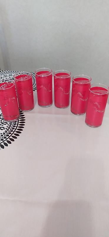 Məhsul: Qədimi şirə/sok stəkanı dəsti - Sayı: 6 ədəd - Dizayn: Şüşə üzərində qırmızı çiçək naxışları - İstifadə: Təzədir, istifadə olunmayıb - Qiymət: 10 AZN Hündür, şirə və sərin içkilə...