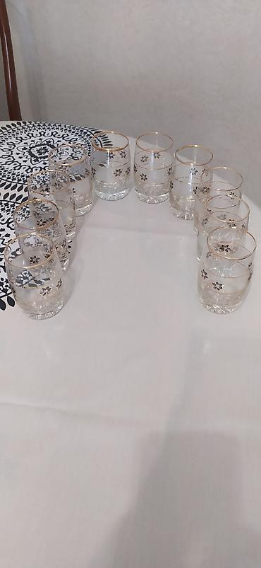 - 12 ədəd qısa stəkan: şəffaf şüşə, qızılı haşiyə və kiçik çiçək naxışları. Gündəlik servis və qonaqlama üçün ideal ölçü.