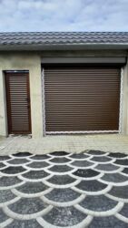 Qəhvəyi rəngdə avtomatik jalüz tipli qaraj qapısı - Material: davamlı alüminium lamellər - Tip: yuxarıya doğru yığılan (roll-up) sistem - İdarəetmə: avtomatlaşdırıla bilən mexanizm; əl ilə açıb‑ba...