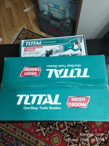 Qeyd: Şəkillərdə ayrıca bir TOTAL “Mixer 1800W” qabı da görünür, lakin bu elan 750W güclü TOTAL Reciprocating Saw (elektrik qayıdış mişarı) üçündür.