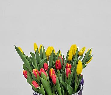 Ağ, sarı və qırmızı rəng çalarlarında tülpan buketləri.