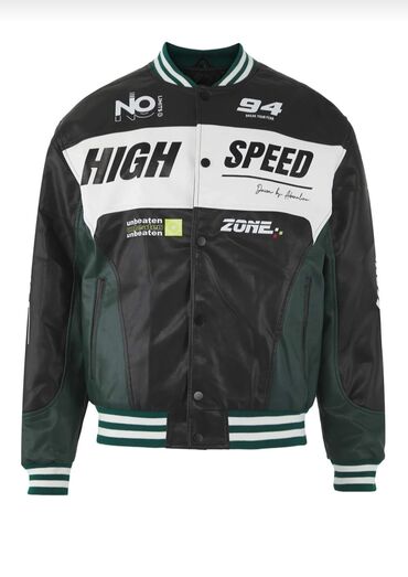 Racing üslublu kişi/yunisex jaketi - Dizayn: İkirəngli qara–ağ kombinasiyası, qarşısı loqolar və yarış tematikası ilə (Speed, Racing, 44, “Speed Faster and Stronger”, dama bayraqları). Qolların üz...